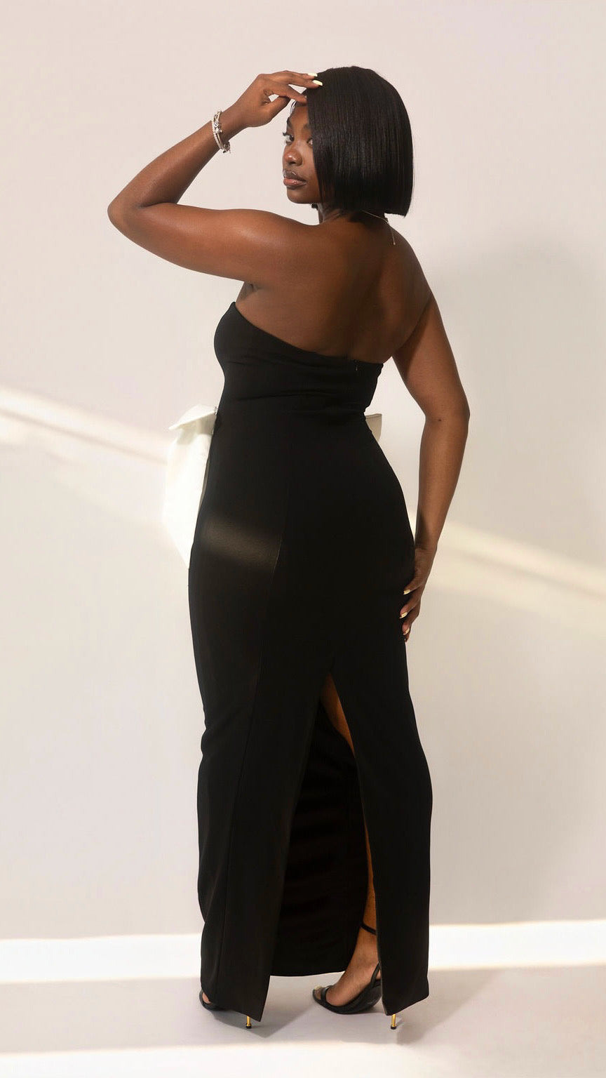 A classic silhouette with a modern twist, The Statement Bow Maxi is designed to turn heads. Crafted in a sleek strapless tube cut, this floor-length dress skims the frame while contrast bows at each hip add a playful yet refined touch. An invisible back zipper and a back kick split ensure comfort and ease of movement, while the clean lines keep the look elevated. Feminine, sleek, and bold in its simplicity—this is elegance redefined.